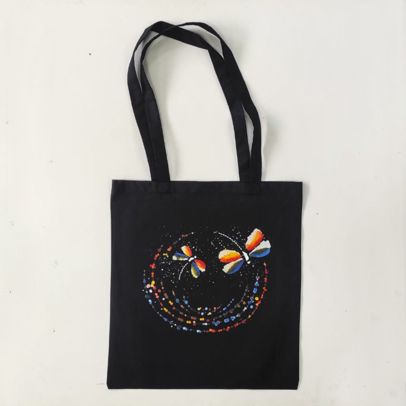 Totebag de color negre amb el disseny "Prosperidad" de l'artista Shakti. Col·lecció “Insectos”.
