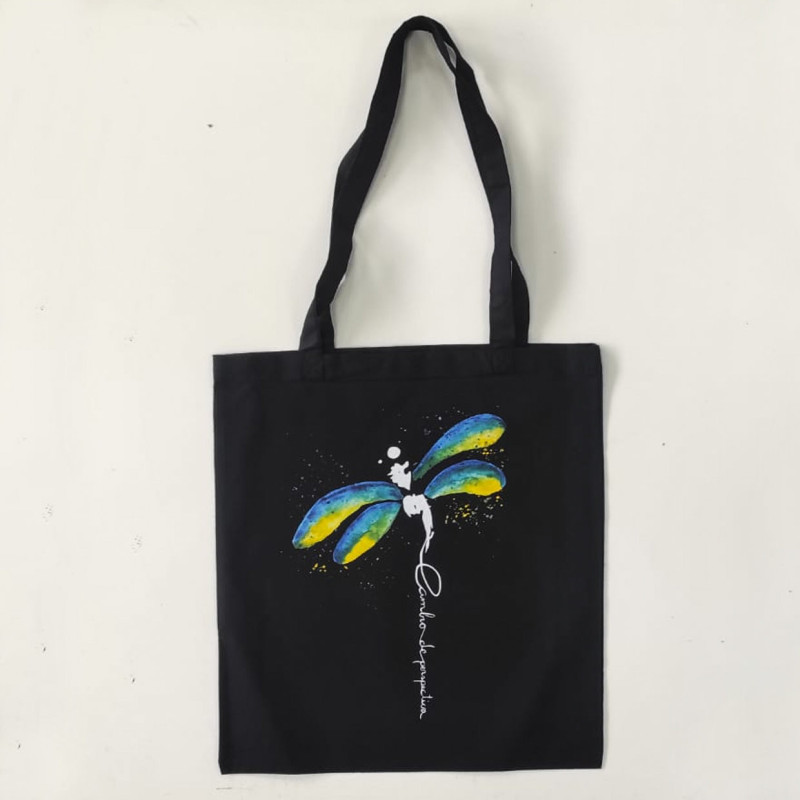Totebag de color negre amb el disseny "Cambios" de l'artista Shakti. Col·lecció “Insectos”.