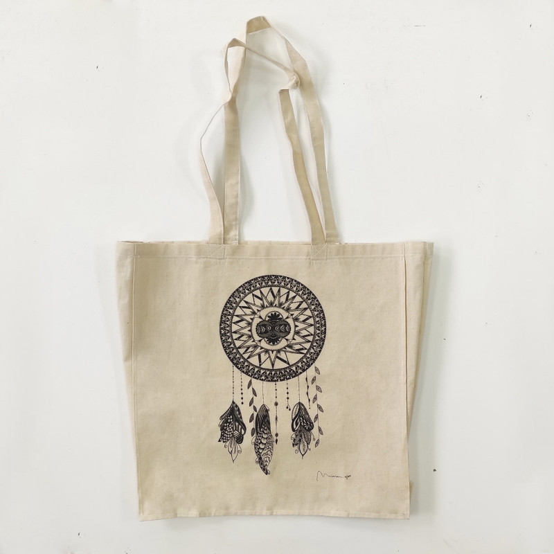 Totebag en color cru amb plec a la zona baixa i laterals. Amb disseny "Soñaré" de l'artista Miriam Macian. Col·lecció “Zentagle”.