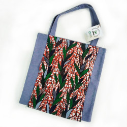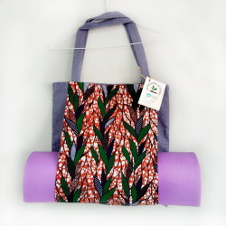 Borsa de ioga dissenyada a Espanya i confeccionada per dones en situació d'exclusió social. Elaborada amb teixit vaquer i teixit artesanal fet a Guinea, combina tradició, dissenyo conscient i producció ètica.