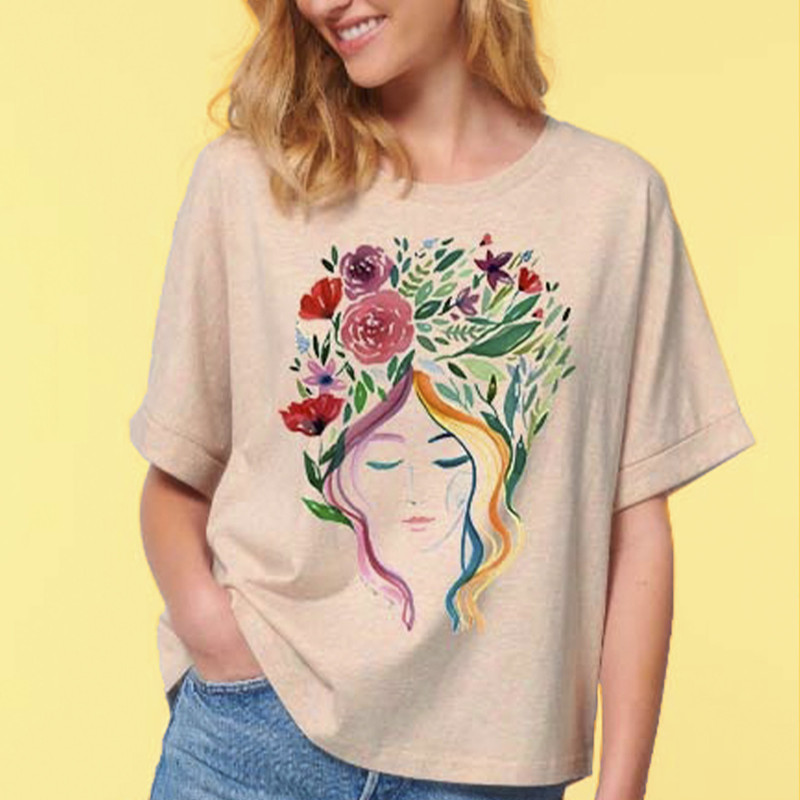 Camiseta creada con la magia de las acuarelas por las manos expertas de la artista Jenia Máslova, donde la suavidad de los trazos invita a conectarse con la naturaleza, a sentir la brisa primaveral y el aroma de las flores en plena eclosión.