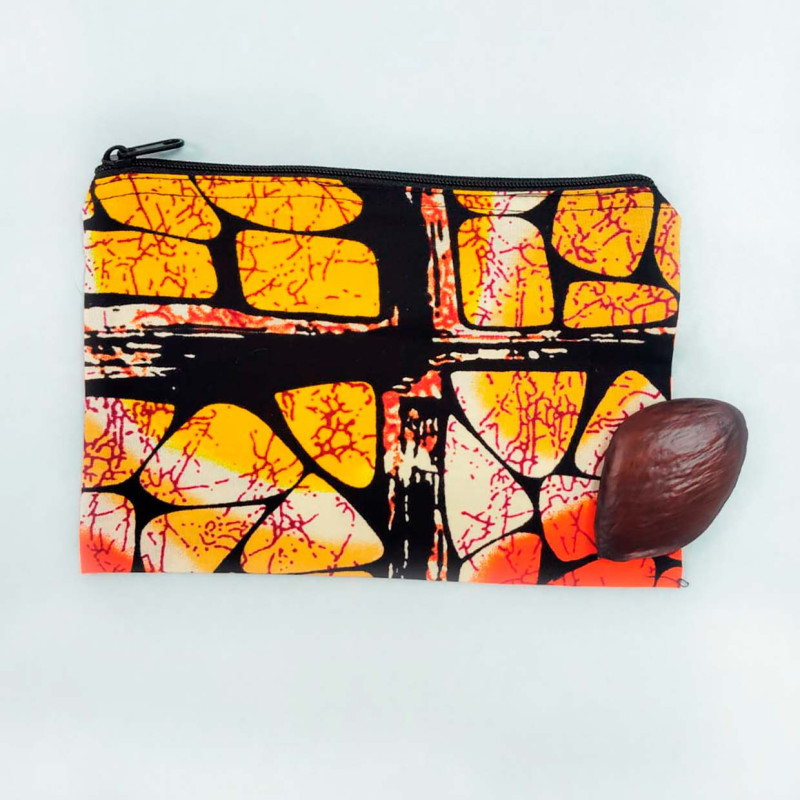 Monedero confeccionado con tejido artesanal de Guinea, lleno de color y tradición.