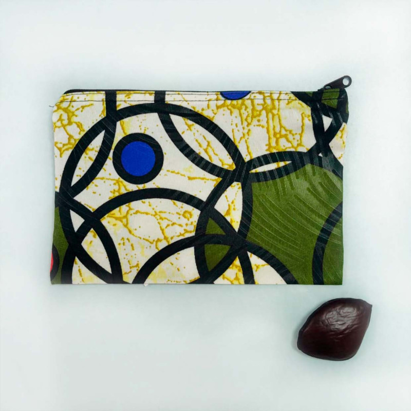Monedero confeccionado con tejido artesanal de Guinea, decorado con círculos étnicos que reflejan la riqueza de la tradición africana.